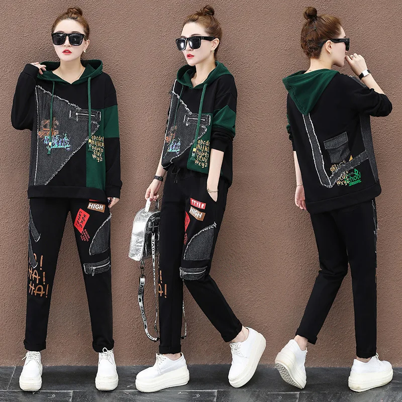 Product Name: フード付きツーピースセット女性スーツトレンディ韓国トラックスーツパッチ2 Pcラウンジ服sweatsuitsスポーツウェアパーカートレーナー
