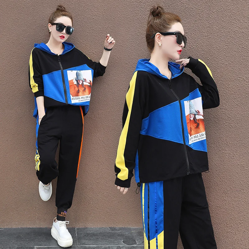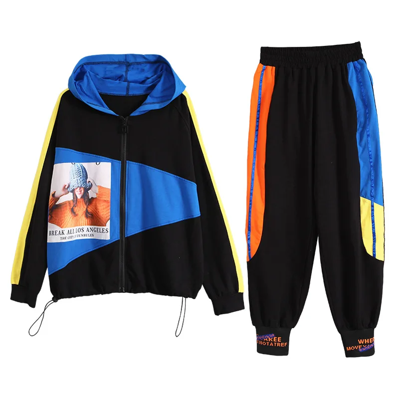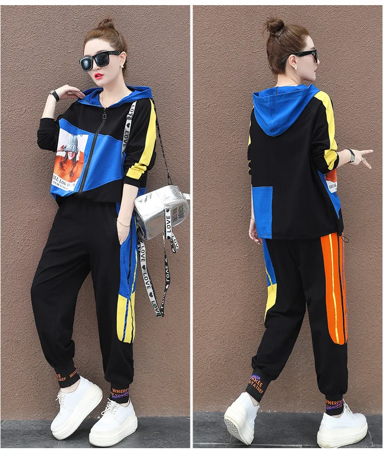 Product Name: フード付きツーピースセット女性スーツ韓国の女性トラックスーツsweatsuitsスポーツウェアトレーナーカラーブロックパーカー衣装2個